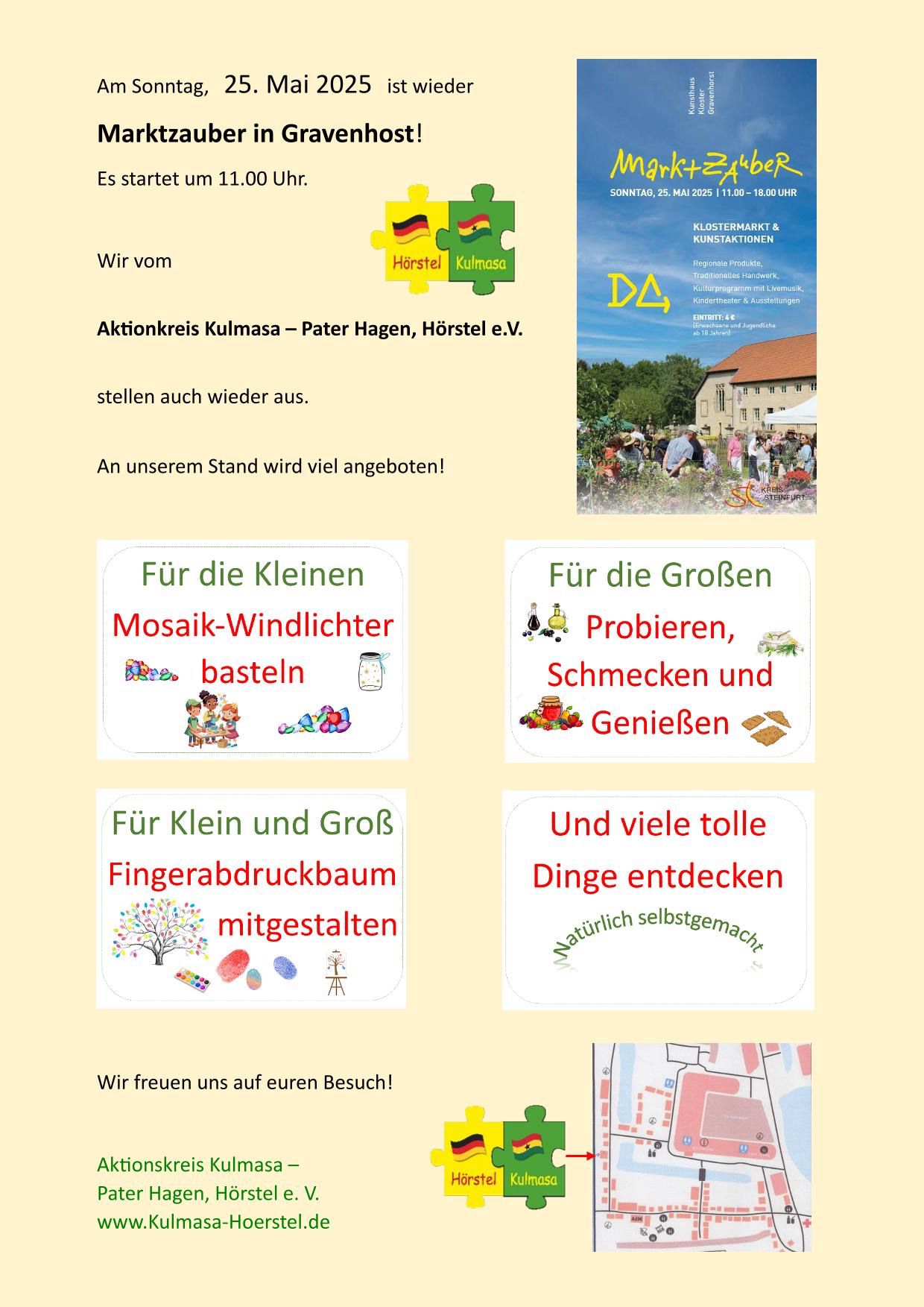 Auf dem Martinimarkt sind wir mit einem Verkaufsstand mit verschiedenen selbstgemachten Produkten vertreten. Hier werden selbstgebastelte Sachen und selbst Eingemachtes verkauft. Der Erlös geht zu 100% als Spende in Projekte für Kulmasa.